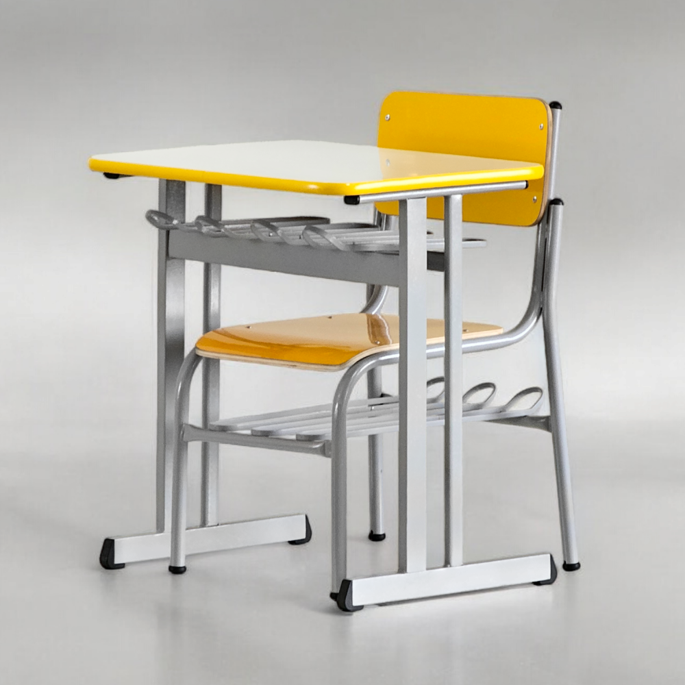 Um conjunto para aluno muito espaçoso e com o dobro de resistência. É possível combinar cores distintas entre suas peças, personalizando sua sala de aula.