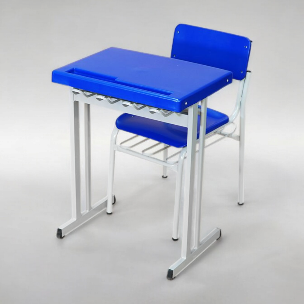 Conjunto moderno e com uma adição extra de resistência, plásticos disponíveis na cor azul escura, porta-livros em ambas as peças garantem espaço extra ao usuário .